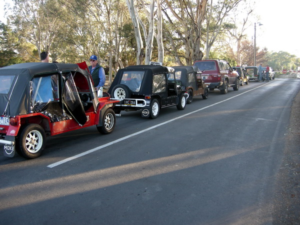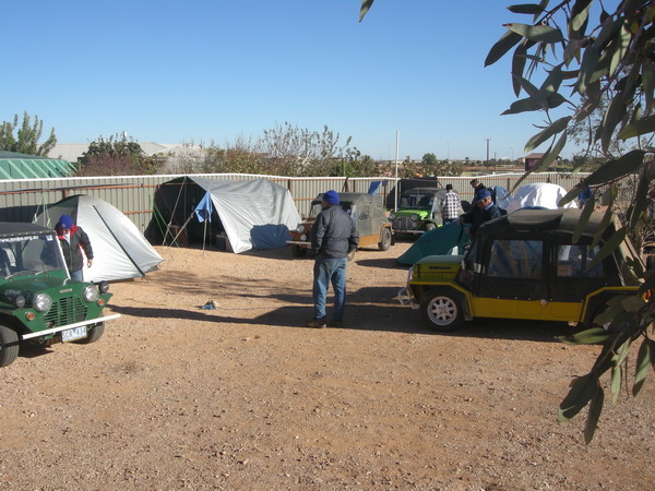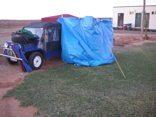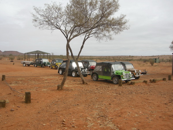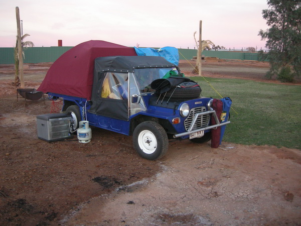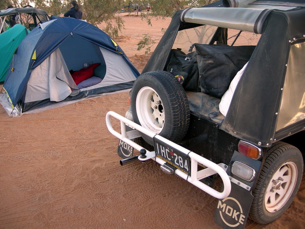 | 07:35 June 6th ...including Paul and son John who had driven their Moke from Western Australia and camped out like this all the way. Dave was the 11th sleeper. He also drove from Perth, but in a Moke with a fast back hood and no side curtains! |