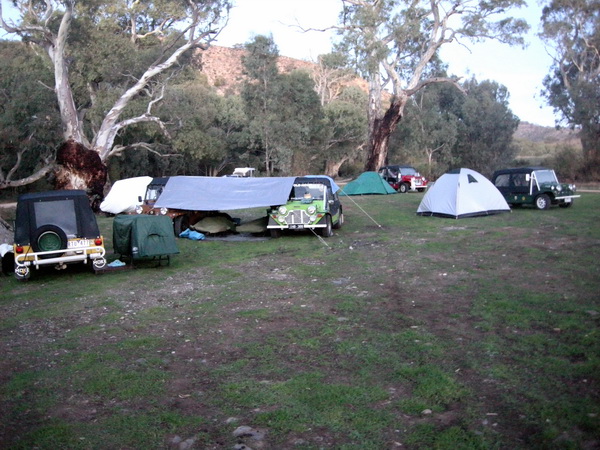 | 16:15 June 8th Pitched and ready for two nights under the Desert Oak. Later in the day Mokees Paul, John and Cos caught up and camped with us, as did others of the WA mob who had OVs (other vehicles). That night we had 15 people around the campfire singing 'Moking There & Moking Back'. |
