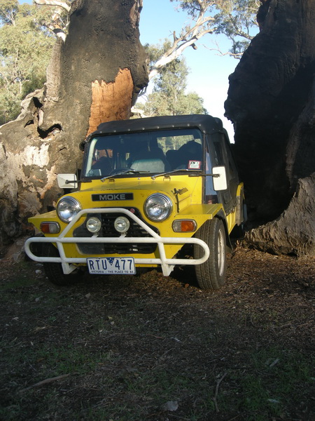 | 8:57 June 2nd Before we left Gerry wanted to try something private with his car and a tree. And the Sky god sent lightning to split the tree asunder and give forth its Moke. Nothing shall stop heaven's Moke from fulfilling it's destiny. |