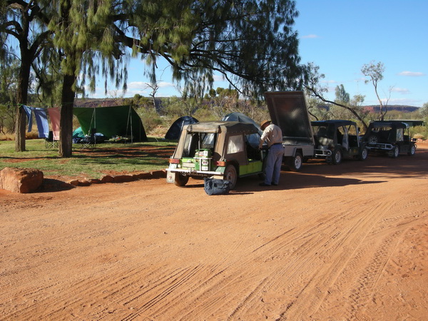 | 18:05 June 10th We arrived in Alice Springs late in the afternoon for four nights in cabins. The cars were stripped of their baggage so we could leave them in town without being concerned about theft. It's illegal to drive around town with jerry cans of fuel anyway. |