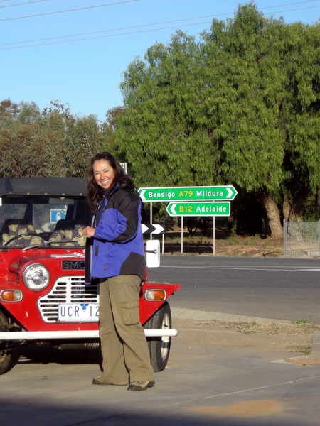 | 09:04 June 1st Ouyen fuelling up for the second day. Laura looks like she is ready for the adventure. We have come from Bendigo and today we will cross the Murray River about half way between Adelaide and Mildura. |