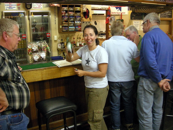 | 15:17 June 17th For someone who seems to be the only person in this landscape, Laura seems remarkably cheery. Island Lagoon rest stop not far north of Pimba. |