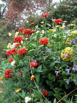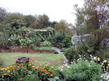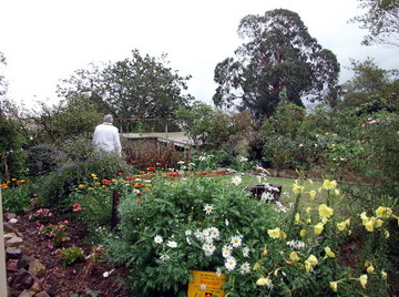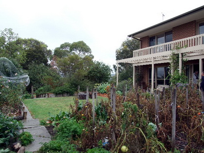 Pre-existing mature fruit trees frame vegetables, natives and flowering exotics in an abundant densely planted garden around a 1990s passive solar house with many sustainable features and incorporating parts of an earlier house.
