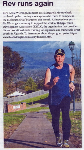 | At time of writing it is only two days until October 13th when St. Margaret's minister Arnie Wierenga will run the Melbourne Half-Marathon to raise funds for RYDA's on-going work.