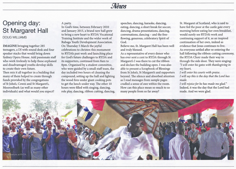 - At the suggestion of a member, on August 23rd, St. Margaret's wrote to Sammy Stamp (a mission of the Uniting Church Adult Fellowship) asking for support to help RYDA continue building the new boys' dormitory.