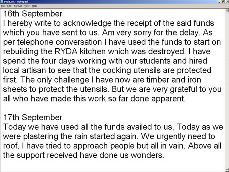 We could not see how our supporters could possibly give for a roof. Mid-August 2725 USD was sent for start up kits for graduating students. Then the additional September donation. RYDA was going to have to figure this one out themselves.