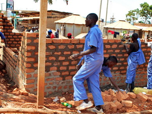 These photos show Bricklaying and Concrete Practice students constructing a new office for the Buloba police station.