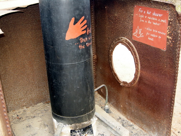| First light a fire in the water heater if you want a hot shower. That depends on finding dry wood of course. |