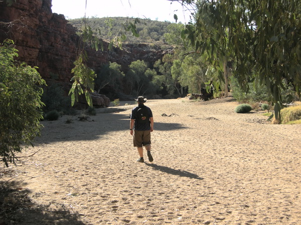 | 15:42 June 12th Crossing a (thankfully) dry river bed, possibly Ross River to enter Trephina Gorge. Judging by these Ghost Gums there is water here somewhere. |
