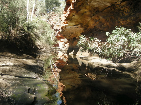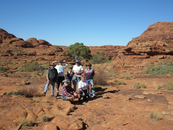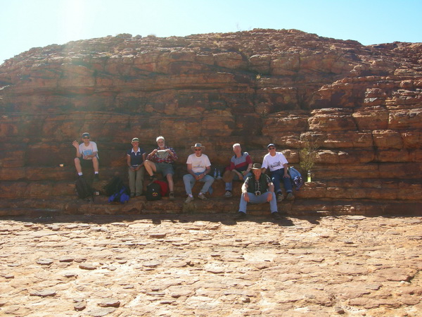 | 12:56 June 9th There could be worse places for lunch. This was about the only place with shade. This was winter, but the shade was still welcome. The shelf is only metres from a deep drop to the creek walk below. From left: Scott, Laura, Doug, Bob, Glenn, Gerry & Jill. Allen stayed in the car park. |