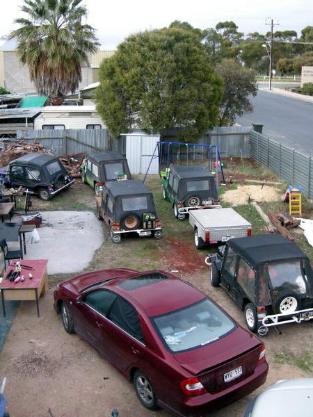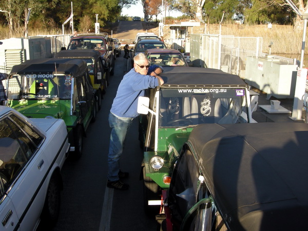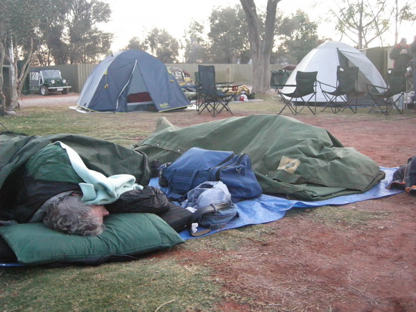 | 07:35 June 6th ...including Paul and son John who had driven their Moke from Western Australia and camped out like this all the way. Dave was the 11th sleeper. He also drove from Perth, but in a Moke with a fast back hood and no side curtains! |