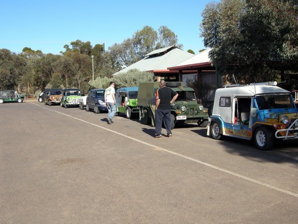 | 08:49 June 18th The parting of the ways. Scott and Laura aren't going anywhere because Smokey has developed a hole in one of its pistons or valves. Gerry and Yella Fella are leaving early because he is turning right at Pt. Augusta and heading for Perth. Only 5 will be making the last stage of the trip back into Victoria. |