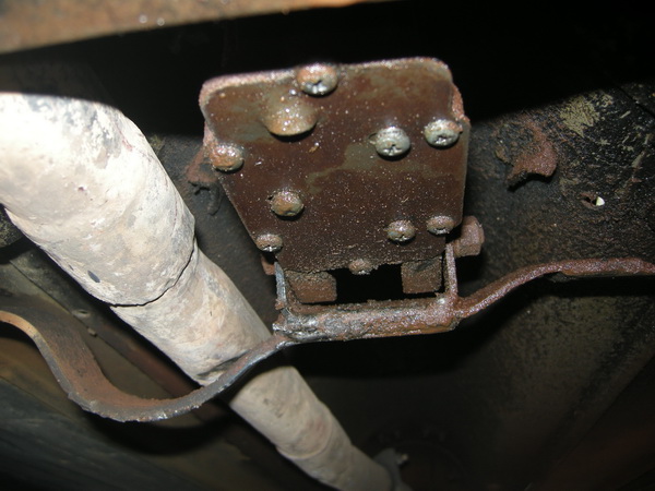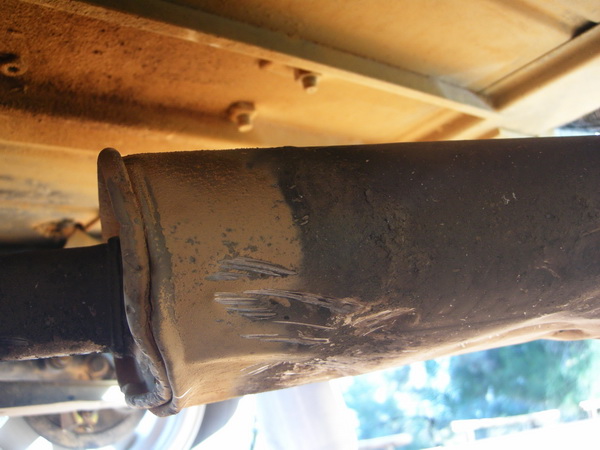 | ...and that the gear selector support bracket had received a serious thwack, almost splitting the exhaust. What didn't show on camera was a thumb-size crater gouged out of BD's 1/4" steel sump guard. |