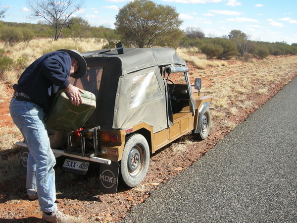 | 14:23 June 8th Five kilometres short of King's Creek Station and Bob's 25 litre tank needs a final top up. |