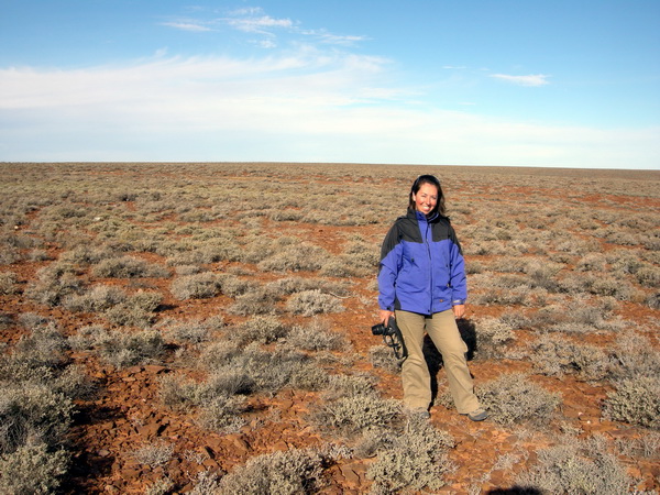 | 15:17 June 17th For someone who seems to be the only person in this landscape, Laura seems remarkably cheery. Island Lagoon rest stop not far north of Pimba. |